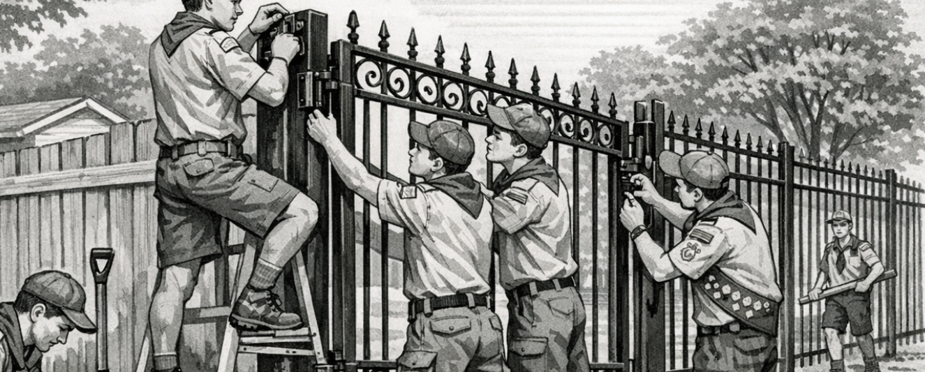 For my Eagle Scout Service Project, I will lead and manage the installation of a steel single-swing driveway gate system for the church. The project includes installing an 18-foot "Madrid Style" steel driveway swing gate, a 5-foot steel pedestrian gate, and four 8-foot steel fence panels. All posts, gate panels, hinge hardware, and fencing components are provided in the gate kit. The project will require site preparation, precise measurement and layout, post-hole digging, concrete mixing and pouring, setting steel posts, attaching gate hardware, and securing all fence panels.